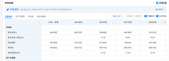 根据天眼查APP中的财报数据,从2024年一季度来看,营收近五年来新高,一季度营收来到348.33亿,净利润也是五年来一季度新高,为146.35亿。