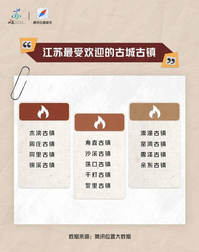 水乡古镇一直是“水韵江苏”的一大标签。《报告》显示,在江苏省的热门古城、古镇、古村景区中,以周庄古镇、同里古镇为代笔的古镇,受到了游客的青睐。值得注意的是,苏州贡献了江苏甚至长三角地区的绝大部分热门古镇。