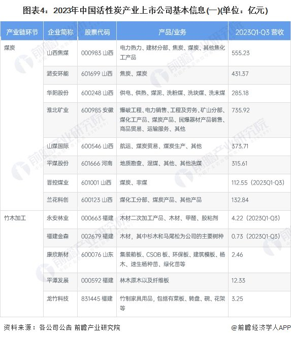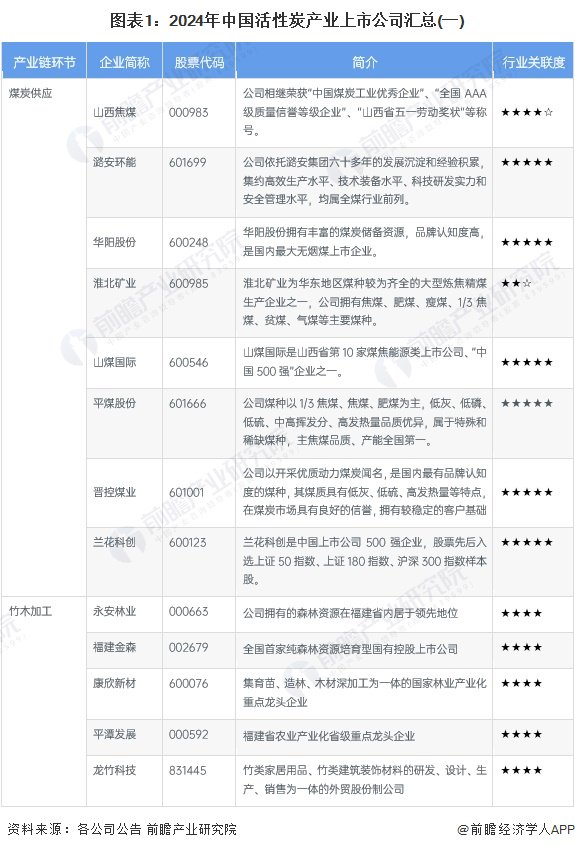 目前,我国活性炭相关产业链上游产业主要是煤炭供应以及竹材“三剩物”的上市企业,中游活性炭生产企业主要包括木质活性炭和煤质活性炭生产企业等,产业链各个环节具体上市公司包括: