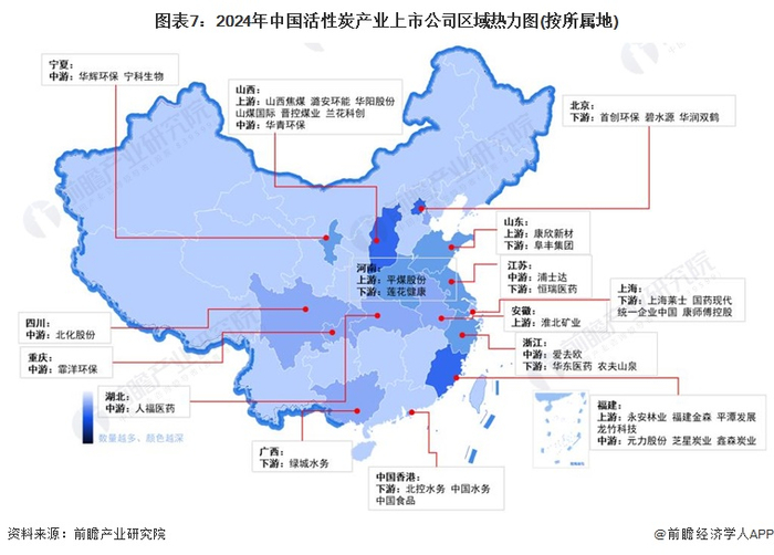 活性炭产业链上的上市企业遍布全国多个省份,其中主要集中在福建省和山西省,其中福建省活性炭上市企业数量最多,具体包括元力股份、芝星炭业、鑫森炭业等。活性炭企业的区域布局与上游煤炭及木竹“三剩物”企业布局相近。