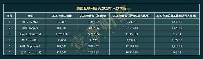 同时,我们也把目光投向了美国,进一步统计了六家美国互联网巨头的营收人效情况,Meta、苹果、奈飞和谷歌都在1000万元以上。