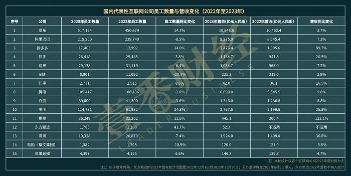 壹番(ID:finance_yifan)以15家互联网大厂年报为基础,统计了过去两年的员工人数、营收变化,并据此计算了单位员工营收人效。这个关键指标变化能够引出大厂们背后的一系列聚焦主业、内部变革和组织调整的故事,也为投资者提供趋势性方向。