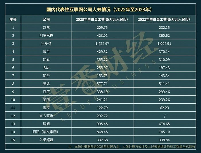 5月14日,阿里与腾讯同一天发布今年Q1财报,健康增长成为二者的共同表达,但同时,“降本”这件事依旧在横行,以阿里为例,一季度减少了超过1.4万员工,放到更长远的时间,从2021年12月底到现在,阿里少了5.4万人。“降本”背后,人效这一词也逐渐成为互联网界的高度认知。不断创造增长奇迹的拼多多,以2023年为例,约1.7万人员规模做到了2476亿元营收,而另一边的京东则在51万员工的情况之下于2023年完成了10846.6亿营销,拼多多的人效着实让市场和竞争对手为之惊艳;在今年3月份,字节跳动的飞书宣布裁员,根据晚点LatePost报道,飞书每人每年带来的订阅收入约为28万元,低于字节平均工资成本,让外界理解了字节跳动为何砍刀劈向飞书,也让关于互联网人效的讨论再度蔓延……