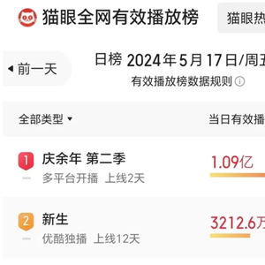 根据腾讯视频披露的数据,《庆余年2》5月16日晚开播,有近1800万人预约,刷新全网电视剧最高预约历史纪录。《庆余年2》开播25小时(截至5月17日21时)热度值破33000,创腾讯视频站内开播热度值最快破33000纪录。