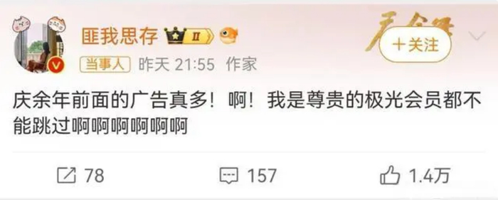 作家匪我思存发微博称:“庆余年前面的广告真多!尊贵的极光会员都不能跳过。”
