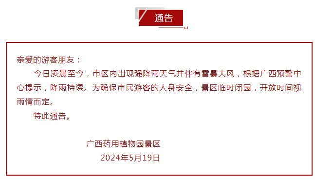 5月19日,广西药用植物园景区采取临时闭园措施,暂停对外开放。具体开放时间另行通知。