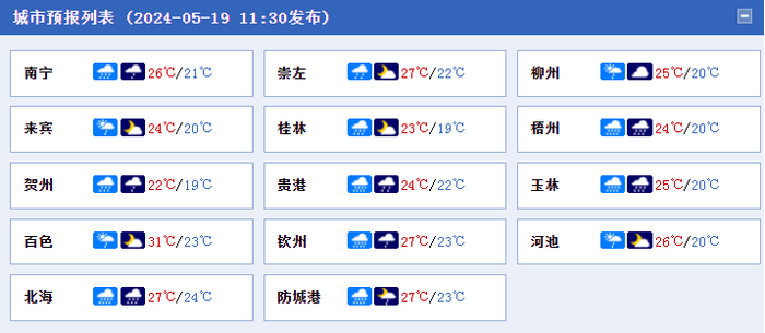 19日晚上到20日(明天)白天,贺州、梧州、贵港、玉林、北海、钦州、防城港等市有大雨、局地暴雨到大暴雨,其他地区多云到阴天有阵雨或雷雨、局地大雨。