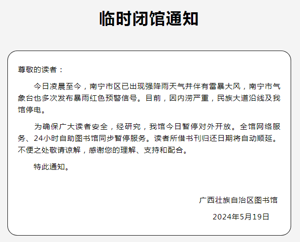 5月19日,广西壮族自治区图书馆发布了暂停对外开放的公告。全馆网络服务、24小时自助图书馆同步暂停服务。