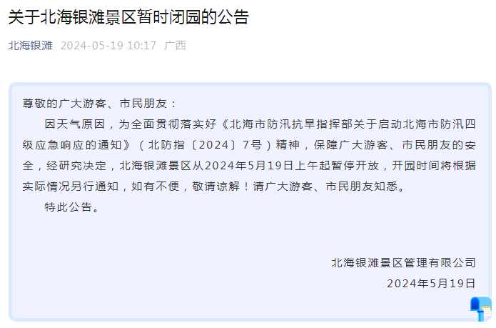 5月19日,北海银滩景区发布暂时闭园公告:从2024年5月19日上午起暂停开放,开园时间将根据实际情况另行通知,如有不便,敬请谅解!