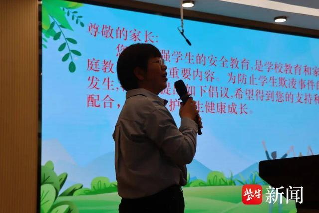 电子屏上,投放“预防学生欺凌 致家长一封信”,醒目直白,盐城公安局亭湖分局关工委委员董丽秋登台播报,字字句句,传递着共同治理学生欺凌问题的决心和信心。