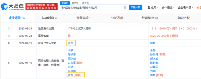 天眼查信息显示,2022年7月,云南孟连农村商业银行的法定代表人由许路变更为周繁。