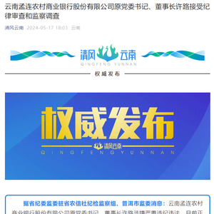 日前,云南纪委监委官微“清风云南”通报称,云南孟连农村商业银行股份有限公司原党委书记、董事长许路涉嫌严重违纪违法,接受纪律审查和监察调查。
