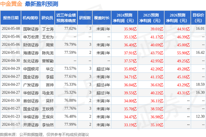 华福证券有限责任公司王保庆近期对中金黄金进行研究并发布了研究报告《2023年报及2024一季报点评:金/铜价格上涨带动业绩同比高增,老牌黄金企业仍有潜力》,本报告对中金黄金给出买入评级,认为其目标价位为19.06元,当前股价为14.75元,预期上涨幅度为29.22%。