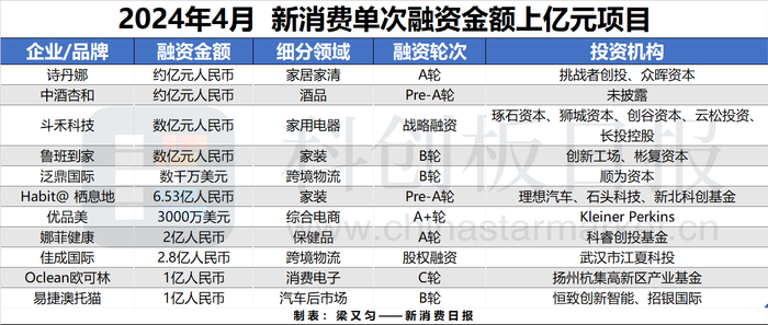 4月获投金额上亿元的项目重回正常水平,总计为11起,以A轮及B轮为主,家居家装、跨境物流、电商等占比不少。此外值得关注的是,投资机构抱团投资的情况有所减少,1~2家机构完成上亿元的情况成为主流,显示消费类投资信心有所恢复。