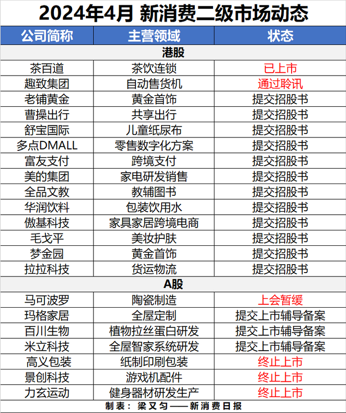 4月共有13家消费类相关公司递交港股上市申请,从消费升级的美妆、首饰、网约车、数字零售、跨境支付,到基础消费领域的儿童纸尿布、教辅书、家电、家具、饮用水等,种类十分丰富。