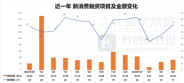 财联社创投通数据显示,2024年4月国内消费相关领域披露融资事件71起,同比增长2.9%,环比增长29.1%;据已披露的投融资金额显示,4月消费相关领域累计融资32.24亿元,同比增长56.3%,环比增长25.9%。