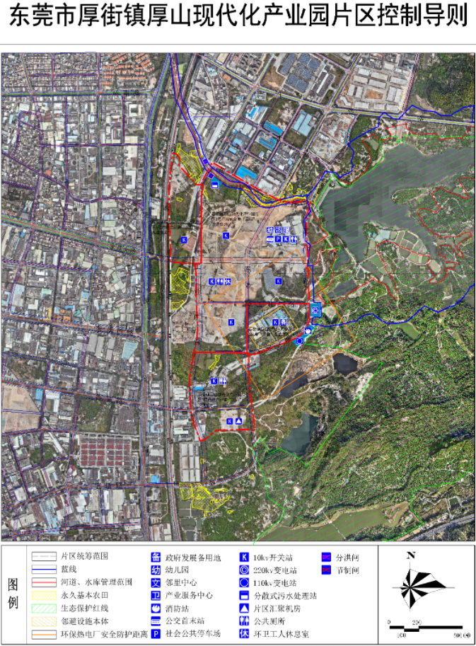 公示内容显示,厚街镇厚山现代化产业园区位于厚街镇南部,与大岭山森林公园相邻。园区范围北至三丫陂水库、振兴路与水口街,西至广深高速路,南至宝塔路,东至东业路、规划一路与白石山,总面积约198.66万平方米(2980亩)。
