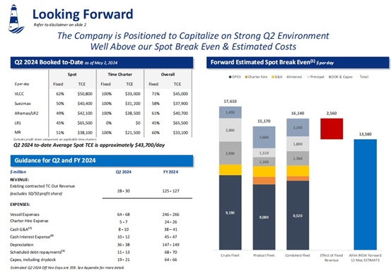 截至目前,该公司拥有并运营80艘船舶,其中包括13艘VLCC,13艘苏伊士型油轮、5艘阿芙拉型油轮/LR2型油轮、13艘LR1型油轮和36艘MR型油轮。其整个船队在未来12个月内的每日盈亏平衡点约为13580美元,处于业界领先水平。