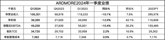 2024年一季度,Ardmore实现净营业收入1.1亿美元,同比下降10.1%,环比增长7.5%;调整后的息税折旧摊销前利润(AD EBITDA)达到4925.8万美元,同比下降10.4%,环比增长30.2%;净利润达到3838.9万美元,同比下降12.9%,环比增长42.1%。