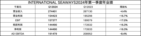 2024年第一季度,International Seaways实现营业收入2.7亿美元,同比减少4.4%;营业利润为1.5亿美元,同比减少16.7%;调整后息税折旧前利润(EBITDA)为 1.9亿美元,同比减少8.4%;净利润达到1.4亿美元或每股2.95美元,同比减少16.3%。