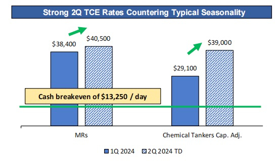 Ardmore旗下MR船队在2024年一季度日均TCE达到34720美元,单船日均管理成本为7382美元,同比增加0.5%。特别值得一提上的是,Ardmore持续改善资产负债表,其MR船队2024年的每日盈亏平衡点为13250美元。