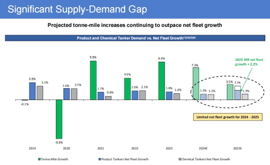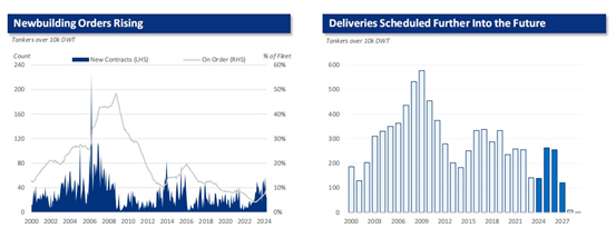 他说,“大多数新造船订单预计将在2025年交付。此外,全球成品油轮船队正在老化,导致大量船舶可能需要被拆解,这进一步支持了市场的积极前景。”