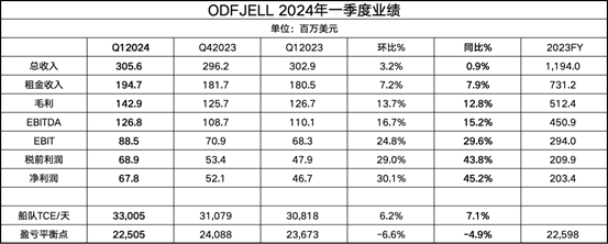 2024年一季度,挪威化学品船船东Odfjell实现总收入3.06亿美元,同比增加0.9%;租金收入(TCE)为1.95亿美元,同比增长7.9%;毛利1.43亿美元,同比增长12.8%;息税折旧摊销前利润(EBITDA)为1.27亿美元,同比增长15.2%;息税前利润(EBIT)为8850万美元,同比增长29.6%;净利润为6780万美元,同比增长45.2%。