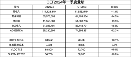 2024年一季度,OET实现总收入1.11亿美元,同比下降1.3%;TCE收入8102.8万美元,同比减少8.4%;调整后的息税折旧摊销前利润(EBITDA)为6523.1万美元,同比减少12.3%;净利润为4155.6万美元,同比增长减少19.5%。