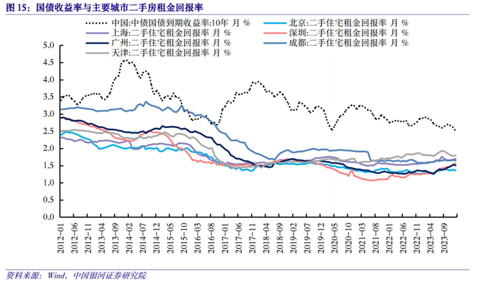 专项债和特别国债的项目发行审批均面临项目长期收益率的考核要求,从目前全国商品住房的年化租金回报率来看,基本处于1.5%左右,低于当前市场资金利率水平(十年期国债收益率:2.31%)。因此,财政资金大规模参与收储需要债券发行利率或二手房收购价格的进一步下行。
