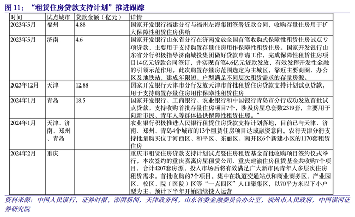 租赁住房贷款支持计划已在加速落地。租赁住房贷款支持计划共有8个试点城市,2023年以来4个城市已落地,贷款金额总计约40.86亿元。2024年1月证券时报报道农业银行积极推进人民银行租赁住房贷款支持计划落地,目前已与天津、济南、郑州、青岛4个城市的13个租赁住房项目达成融资意向。农行天津分行支持批量购买位于河西区、和平区、东丽区、南开区6个新建小区的1170套租赁住房。同时今年2月重庆市租赁住房贷款支持计划试点暨住房租赁基金首批收购项目签约仪式举行。涉及7个项目,合计4207套房源。
