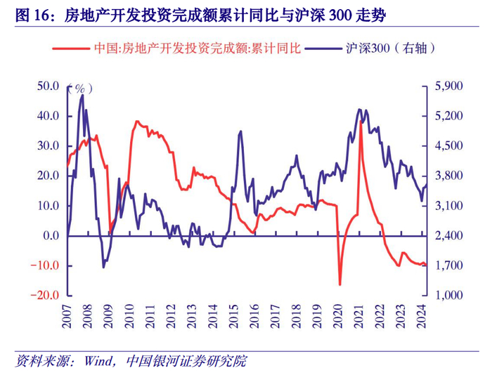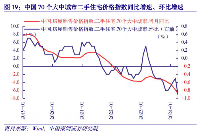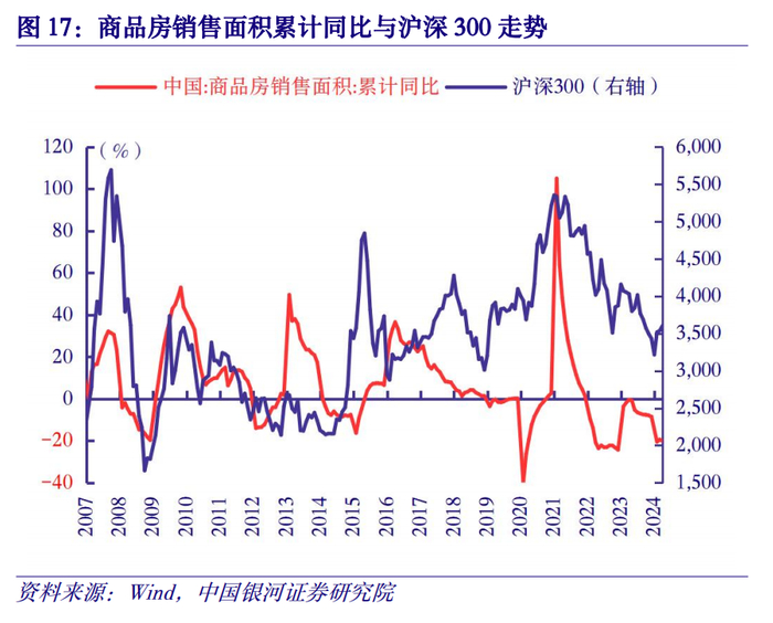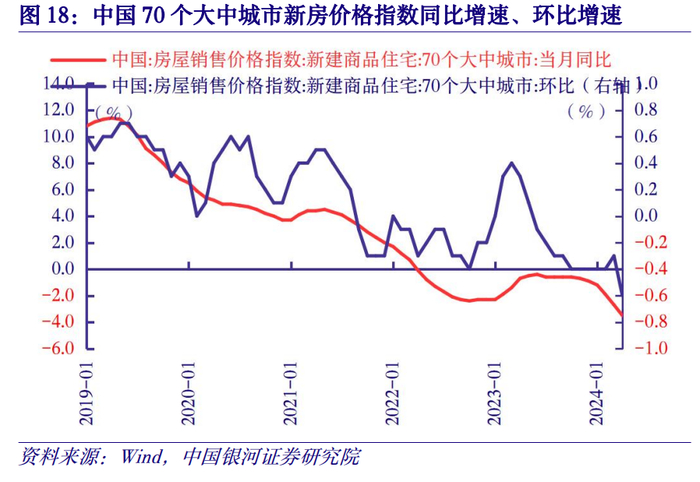 2024年1-4月份,全国房地产开发投资30928亿元,同比下降9.8%,降幅较前值扩大0.3个百分点。房地产销售端延续下降趋势。1-4月份,新建商品房销售面积29252万平方米,同比下降20.2%,其中住宅销售面积下降23.8%;新建商品房销售额28067亿元,下降28.3%,其中住宅销售额下降31.1%。4月末,商品房待售面积74553万平方米,同比增长15.7%。由于房地产市场整体规模大、链条长,在我国经济中占有重要地位,当前国内仍然处于房地产周期去库、新动能增长的转型期。对于A股市场而言,房地产市场的状态也是一大影响因素。