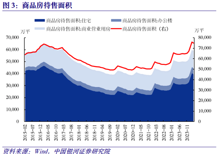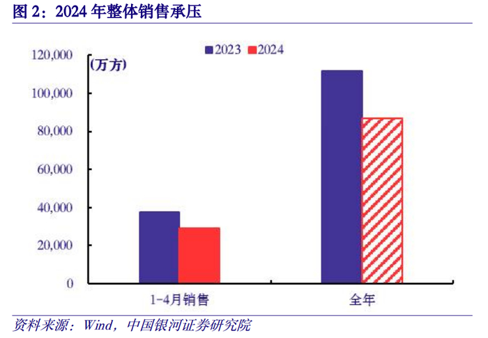 会议提出消化房地产现有库存,主要是因为房地产目前销售表现持续低于预期。截至2024年4月,全国商品房2024年累计销售面积29252万平方米,同比下降20.2%,其中2024年4月单月商品房销售面积6584万平方米,同比下降22.84%。按照2023年全年销售面积135836.89万方计算,2024年1-4月仅完成2023年全年销售面积的26.2%。考虑到2023年3-4月市场表现较好、基数较高的影响,全年销售表现承压。