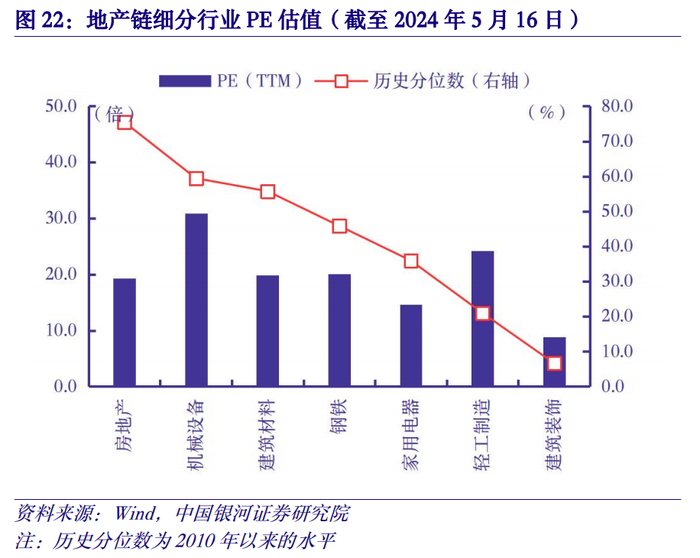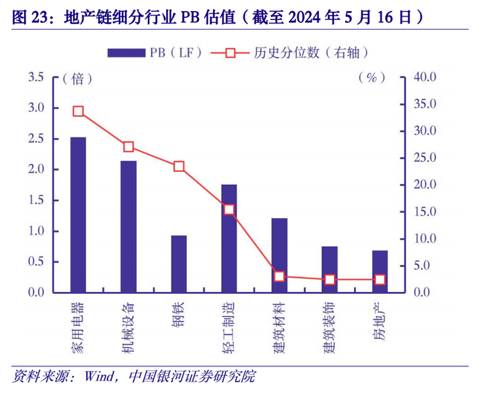 从PE估值来看,截至5月16日,家用电器、轻工制造和建筑装饰行业均处于2010年以来40%分位数水平以下。从更适用的PB估值来看,房地产产业链整体位于历史中低位水平。其中,房地产处于2010年以来2.42%分位数,建筑材料、建筑装饰也均低于历史5%分位数水平,随着政策层面的持续催化,地产产业链存在估值反弹空间。