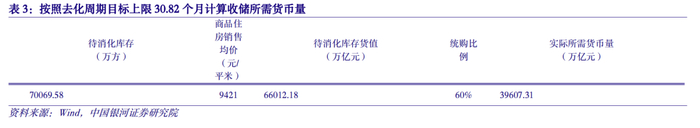 截至2024年3月,全国商品住房累计销售均价为9421元/平米,相当于待消化库存的货值为6.6万亿元。假设统购价格为市场销售均价的60%,则消化广义库存以达到目标去化周期上限所需的货币量约为3.96万亿元。由于目标去化周期的上限为30.82个月,因此假设目标去化周期低于30.82个月,即所需货币量或将高于3.96亿元。