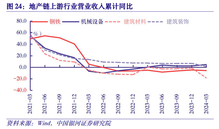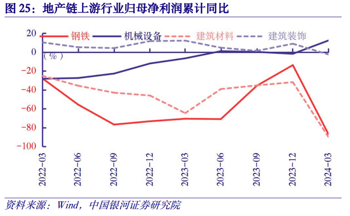 从业绩来看,地产产业链上游表现分化。在地产需求疲弱的大环境下,2024年第一季度,钢铁行业营业收入同比下降5.82%,归母净利润同比大幅下降86.85%。建筑材料行业营业收入同比下降18.56%,归母净利润同比下降89.87%,降幅较2023年明显扩大。建筑装饰行业营业收入同比正增长,但涨幅较此前有所收窄,归母净利润同比由正转负。仅机械设备营业收入累计同比增速环比改善,较2023年上升2.33pct至4.68%,归母净利润累计同比也呈现回升态势。