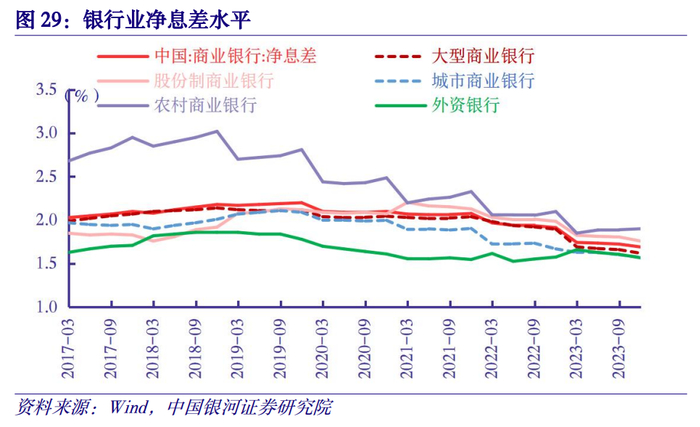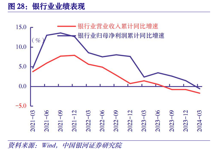 从业绩来看,受净息差持续收窄,以及手续费、佣金净收入等下滑影响,银行业2023年营业收入、归母净利润同比增速分别为-0.81%、1.44%,2024Q1营业收入、归母净利润同比增速分别为-1.73%、-0.61%,增速均呈下降趋势。在房贷利率处于下行通道的背景下,后续还需关注银行业净息差压力,特别是抗风险能力相对较弱的中小银行。
