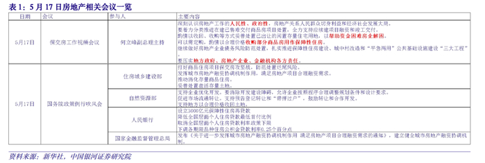 2024年5月17日全国召开切实做好保交房工作视频会议,随后央行连续发布关于调整首付比例以及个人住房贷款利率和公积金贷款利率的三项通知。在下午召开例行国务院吹风会上,包括央行、住建部、金融监管总局和自然资源部在内的四部委负责人具体介绍如何切实做好保交房工作的各项配套政策。