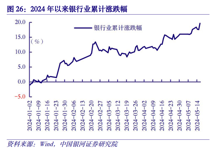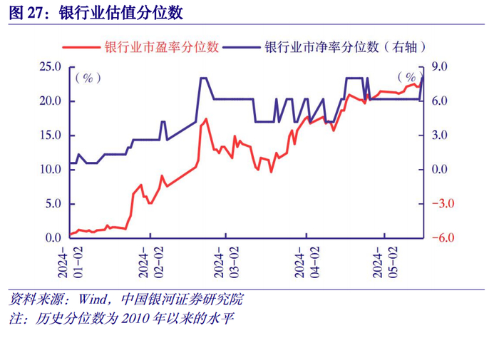 同时,地产政策密集出台对于房企经营环境的改善,也有助于提升银行资产质量,利好银行业行情。2024年以来,截至5月16日,在高股息主题行情叠加稳增长政策加持下,银行业行情表现较优,累计上涨19.62%。从估值来看,在经历上涨行情后,银行业市盈率位于2010年以来23.04%分位数,市净率位于2010年以来8.00%分位数。随着银行资产端质量的改善,银行业估值仍有较大提升空间。