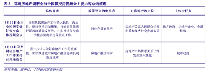 5月17日会议对于保交房政策的继续强化。继4月14日郑州房地产调研会之后,本次会议对于保交房政策的总体要求及支持力度进一步大幅提升: