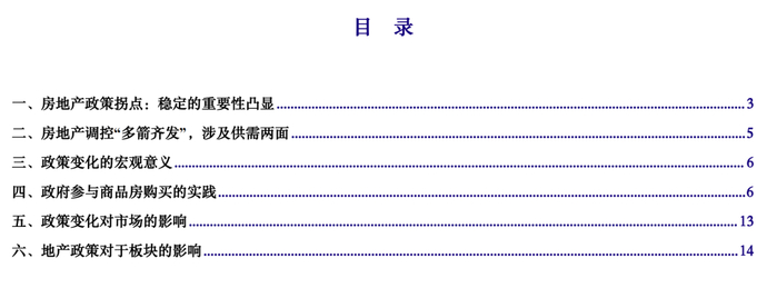 综合考量,全面发力:这次房地产政策组合拳是中央在综合考量当前房地产行业面临的挑战的背景下,在供需两端同时发力来稳定房地产市场:需求侧政策:(1)降低全国层面个人住房贷款最低首付比例;(2)取消全国层面个人住房贷款利率政策下限;(3)下调各期限品种住房公积金贷款利率0.25个百分点。供给侧政策:(1)分类推进在建已售难交付商品房项目处置,全力支持应续建项目融资和竣工交付;(2)酌情以收回、收购等方式妥善处置已出让的闲置存量住宅用地;(3)发挥城市房地产融资协调机制作用,满足房地产项目合理融资需求;(4)支持企业优化开发,促进市场流通转让,鼓励转让和合作开发;政策焦点——“收储”政策:以需定购,酌情以合理价格收购部分商品房用作保障性住房,央行设立3000亿元保障性住房再贷款。