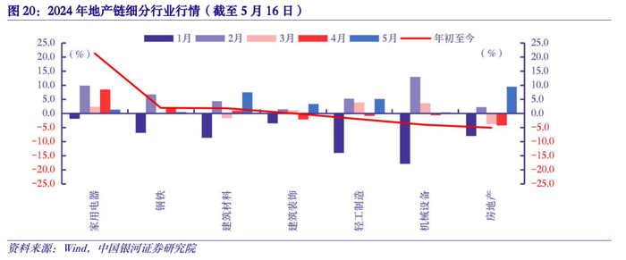 2024年年初以来,截至5月16日,房地产产业链行情表现分化较大,家用电器行业大幅上涨21.21%,钢铁行业上涨1.89%,建筑材料行业上涨1.74%,而在房地产下行周期压制下,其余行业均下跌。其中房地产行业跌幅最深,下跌5.14%,机械设备跌4.12%,轻工制造跌2.09%,建筑装饰微跌0.06%。