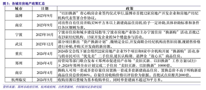 针对目前整体库存承压的情况,供需两侧均有序出台政策。供应端:自然资源部严格控制商品房去化周期超18个月的城市商品住宅用地供应,抑制存量住宅用地不合理增长,控制住宅库存量;需求端:各城市因城施策,通过“以旧换新”和直接收购在售住房两种模式缓解去化压力。