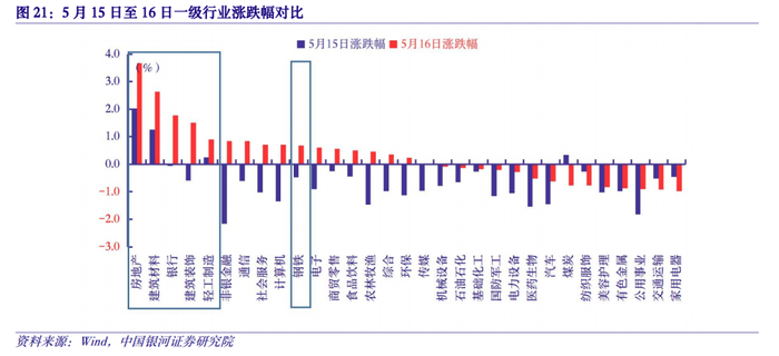 地方政府购买待售房屋等举措,有助于缓解房地产市场压力,房地产行业行情有望受到提振。同时,房地产对上下游相关产业带动效应强。房地产产业链中,尤其是中下游预期改善,或给相关行业行情提供一定支撑。5月15日,杭州临安区公告称收购一批商品房用作公租房,标志着政策创新的正式落地。随后一个交易日,地产产业链多数上涨,走出独立行情。其中,房地产、建筑材料、建筑装饰、轻工制造等行业涨幅领先,而家用电器行业在积累前期涨幅后有所回调。后续随着更多地方政策的跟进,地产产业链行情有望受到持续催化。