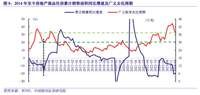 考虑到低能级城市的去化压力较高能级城市大并且上文14城均为高能级城市,我们认为整体的去化周期高于20.28个月。若按照广义库存计算,截至2024年3月,全国商品住房去化周期为37.78个月。按照2014年2月以来的数据类比,2015年2月累计销售同比增速至最低,随后销售同比降幅逐年收窄并于2015年6月转正。2015年2月,广义库存去化周期为30.82个月,因此我们认为去化周期的目标上限为30.82个月。