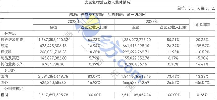 报告期内,光威复材的碳纤维业务16.67亿元收入中,航空应用占比67.56%,贡献销售收入11.26亿元,同比增长24.59%,航天应用占比14.38%,贡献销售收入2.40亿元,同比增长26.14%,气瓶应用占比6.77%,贡献销售收入1.12亿元,同比增长9.97%,非航装备与科研业务占比4.68%,贡献销售收入0.78亿元,同比增长33.10%,碳碳复材业务占比3.68%,贡献销售收入0.61亿元,同比增长272%,工业制造和体育休闲领域合计占比2.93%,贡献销售收入0.49亿元,同比下降57.41%。