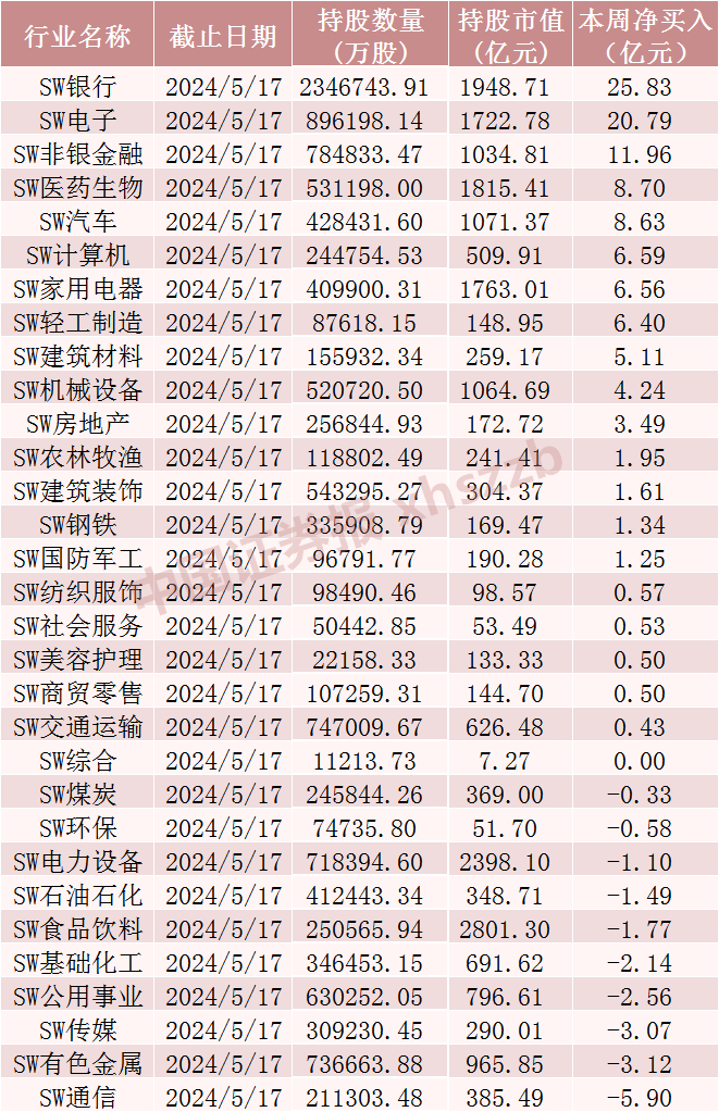 上周北向资金在申万一级行业买入情况