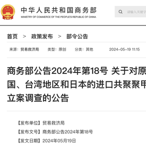 5月19日,商务部发布公告称,自本公告发布之日起,商务部对原产于欧盟、美国、台湾地区和日本的进口共聚聚甲醛进行反倾销立案调查,本次调查确定的倾销调查期为2023年1月1日至2023年12月31日,产业损害调查期为2021年1月1日至2023年12月31日。
