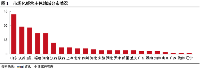 从地域上来看,市场化经营主体主要集中于非重点省份,占比94.09%,且以山东、江苏、浙江等沿海经济发达地区居多,其中山东42家,江苏和浙江各29家,福建22家,居前三位。重点省份中,天津、重庆各4家,云南3家。