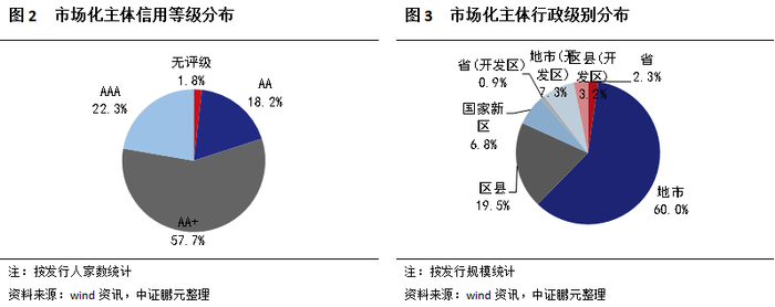 从主体信用等级来看,以AA+级为主,其中AAA级49家,占比22.3%,AA+级,占比57.7%,AA级,占比18.2%,无评级,占比1.8%。