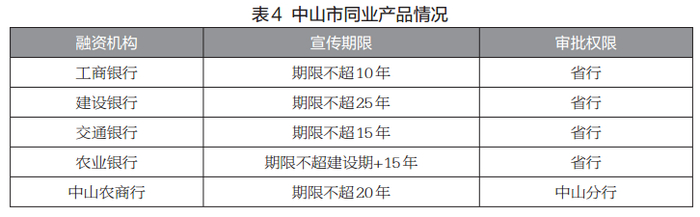 中山当地主要银行是工商银行、建设银行、交通银行、农业银行、中山农商行,同业产品具体情况各不相同。(见表4)